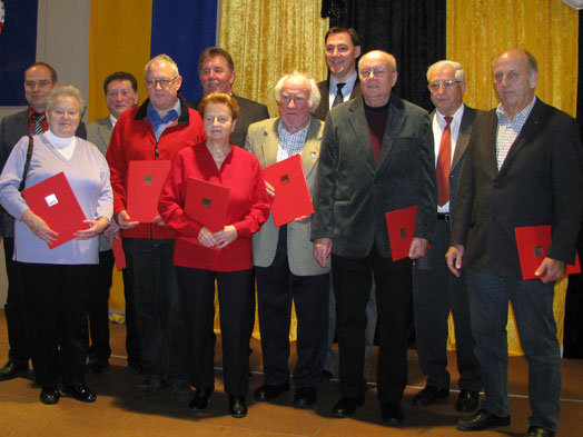 Auf dem Bild, die Geehrten mit den Gratulanten von links nach rechts: Wolfgang Gunkelmann, Ursula Mohrhardt, Heinz Dechert, Gerd Hensel, Ernst Hügel, Gisela Hensel, Werner Mohrhardt, Alexander Fuhr, Karl Gundacker, Hans Bennewart, Alfred Klingel